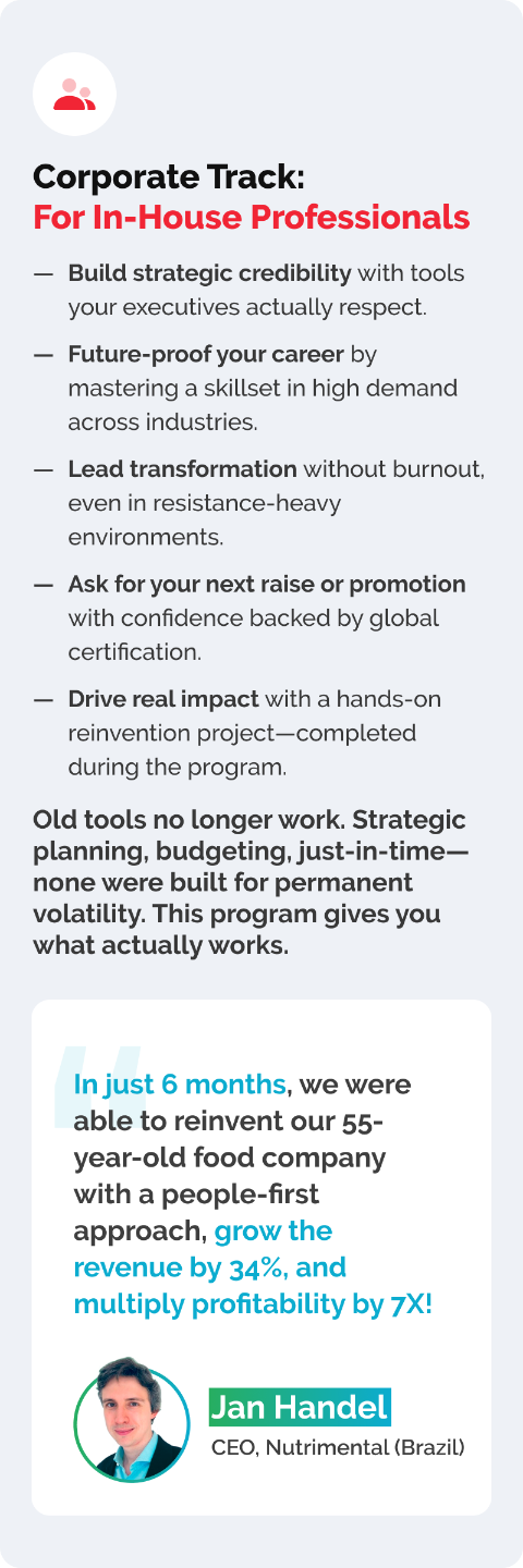 But unlike other programs, I don’t want you to wait for months before kinda, maybe, sorta seeing a result. Enroll right now, go through the first 2 weeks of the foundational Breakthrough Reinvention course, do easy fun engaging exercises (alone or with your team), and make plans for the first real reinvention project to transform your products, simplify your processes, reinvent your business models, or uplift your organizational culture.