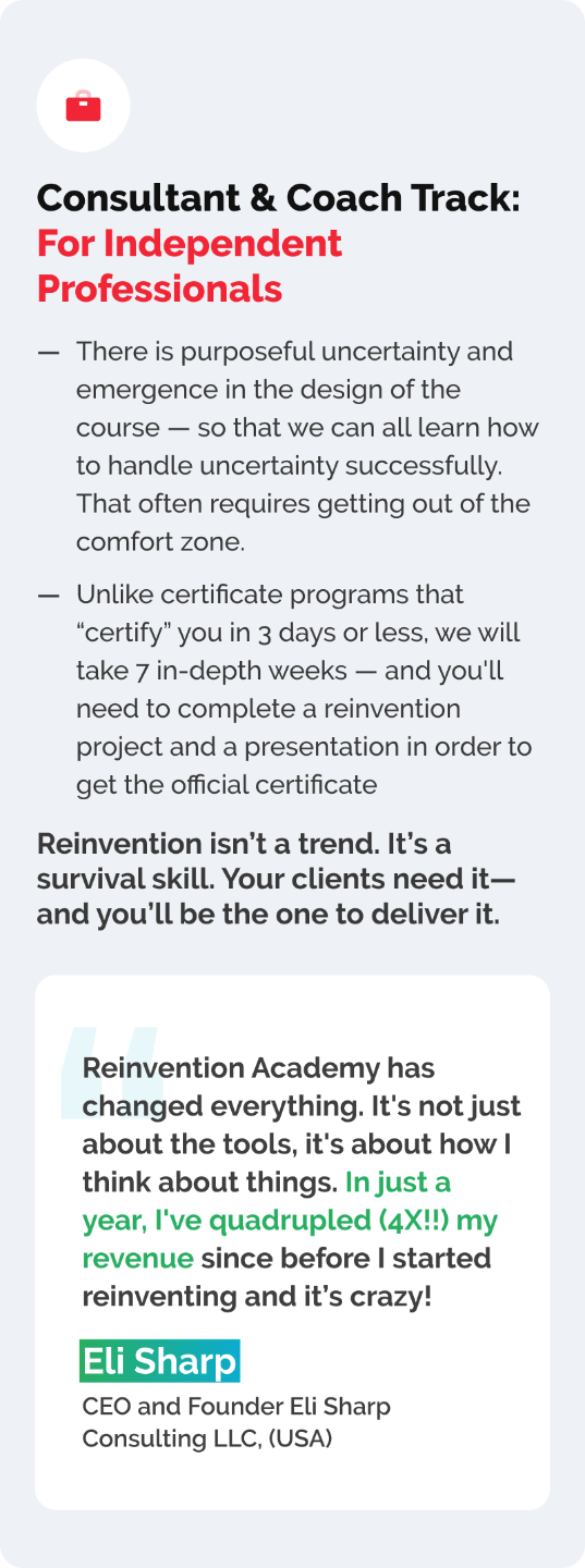 Your name and LinkedIn profile will also be added to the official global Directory of Certified Reinvention Practitioners so that people can easily find a reinvention specialist in their country or area of interest.