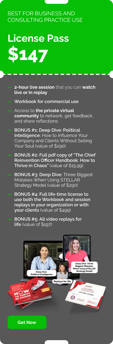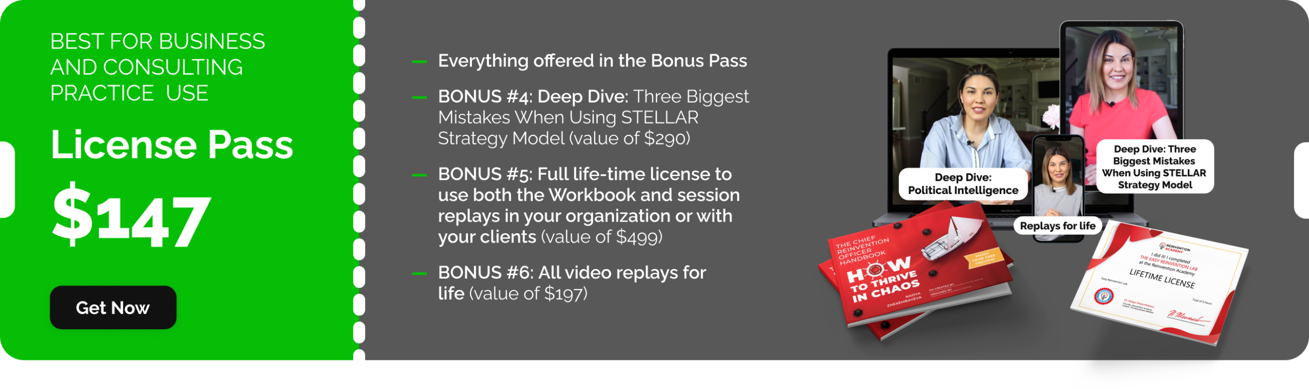Upgrade your Workshop experience with a License or Bonus Pass and get exclusive, immediate access to our on-demand Deep Dive Political Intelligence: “How to Influence Your Company and Clients Without Selling Your Soul”