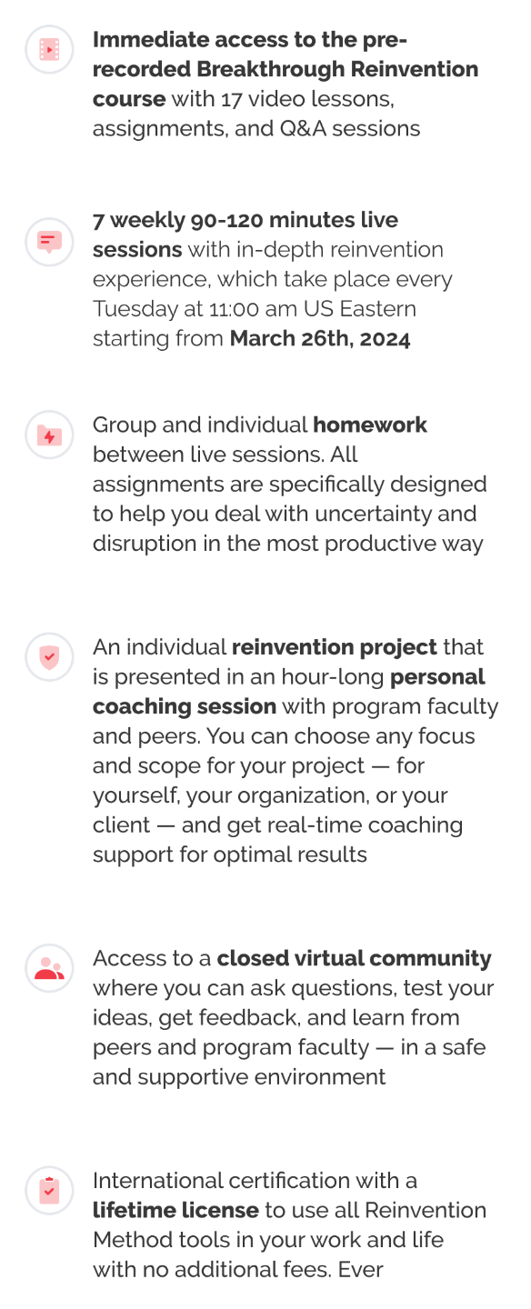 But unlike other programs, I don’t want you to wait for months before kinda, maybe, sorta seeing a result. Enroll right now, go through the first 2 weeks of the foundational Breakthrough Reinvention course, do easy fun engaging exercises (alone or with your team), and make plans for the first real reinvention project to transform your products, simplify your processes, reinvent your business models, or uplift your organizational culture.